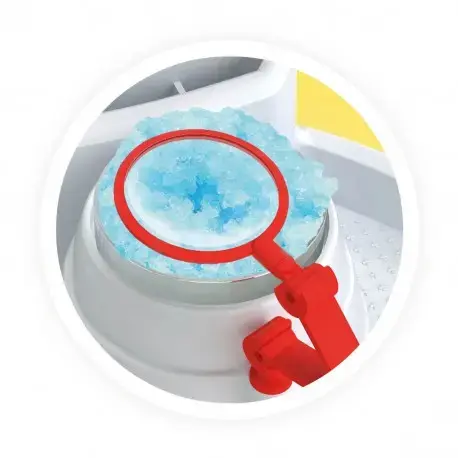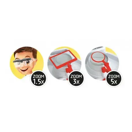 Included : Illuminated workstation, 1 articulated arm, magnifying glass x5, 1 Fresnel lens x3, 1 protective goggles, 1 goggle support, 1 goggle strap, 1 magnifying glass x1.5, 1 blue colouring (5 ml), 1 yellow colouring (5 ml), 1 red colouring (5 ml), 1 sodium acetate (50 g), 1 sodium bicarbonate (40 g), 1 snow powder (20 g), 1 copper sulphate (12 g), 3 petri dishes, 1 black filter, 1 pipettes, tweezers, 1 beaker, 2 measuring cups (100 ml), 1 straw, 1 measuring spoon, 2 stirrers, 1 lens cloth