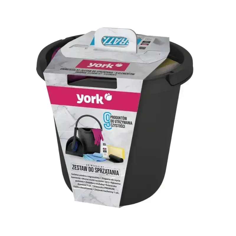 Põhjalik puhastustarvikute komplekt, mis sisaldab 12-liitrist ämbrit, luuda, prügikühvlit, kivipindade puhastusvahendit, 60-liitriseid prügikotte, kummikindaid, 3 puuvillast lappi, kahepoolset käsna ja köögi abrasiivlappi.