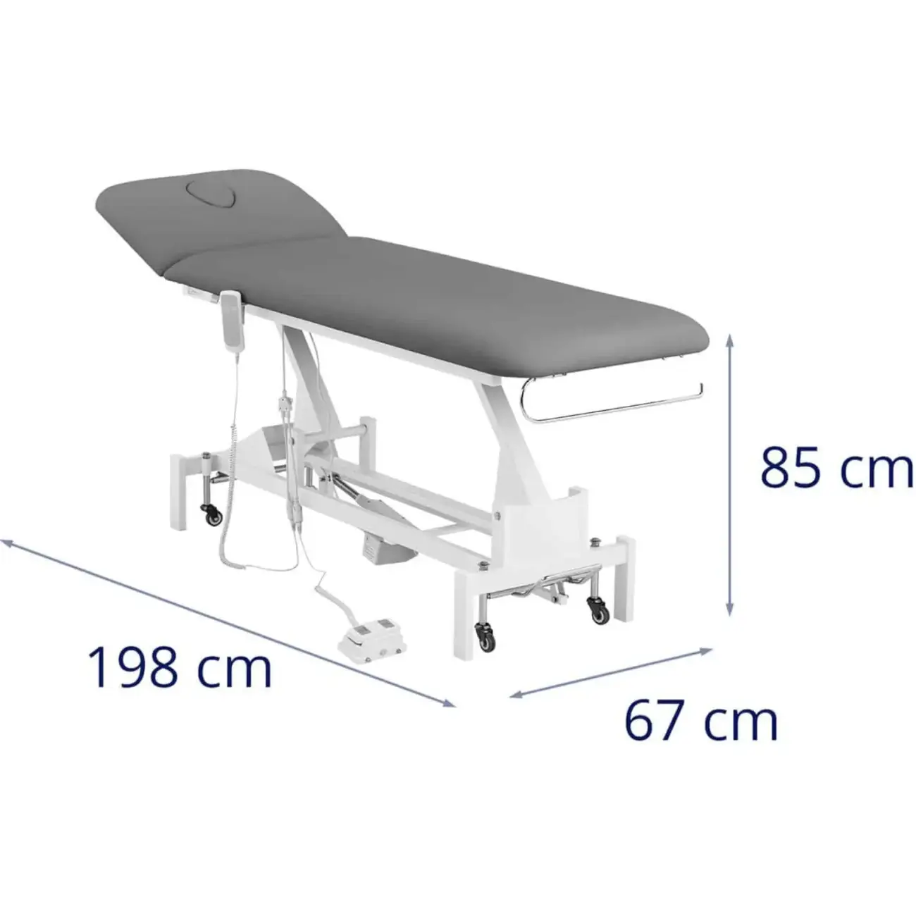 Łóżko do masażu marki Physa jest idealnym wyposażeniem w gabinecie, salonie lub w obiektach SPA Wellness, zwłaszcza dla fizjoterapeutów, masażystów lub kosmetyczek. Stół do masażu posiada bardzo stabilną konstrukcję. Został wyposażony w pilota zdalnego sterowania wraz z wieszakiem i uchwyt na rolkę papieru. Łóżko posiada silnik o mocy 50 W, regulujący wysokość w zakresie 440-900 mm za pomocą ręcznego pilota lub pedału nożnego. Zagłówek można przechylać w zakresie -60 - 35deg;. Pozycję siedzącą lub leżącą opcjonalnie wyregulujesz w zależności od rodzaju zabiegu. Zagłówek posiada zdejmowaną poduszkę. Wypełnienie tapicerki posiada grubość: siedzisko: 80 / oparcie: 80 / podgłówek: 35 mm. Zastosowana skóra syntetyczna sprawia, że leżankę do masażu można szybko i łatwo wyczyścić. Nie wchłania ona płynów ani kurzu. Wysokiej jakości metal z powłoką proszkową i stabilna konstrukcja zapewniają stołowi wytrzymałość i maksymalną nośność 200 kg. Cztery kółka pozwalają na łatwe przesuwanie łóżka.