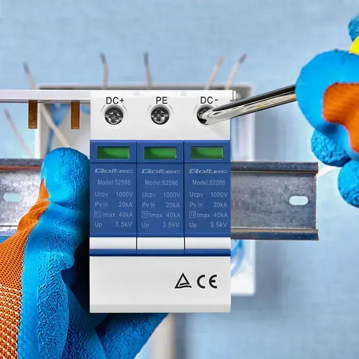 The Qoltec DC surge protector is a surge protection device known for its high effectiveness and reliability. This compact device will protect your appliances from direct current surges and the effects of atmospheric discharges. It ensures your safety by reducing the risk of electric shock and includes a built-in failure indicator for monitoring its functionality.