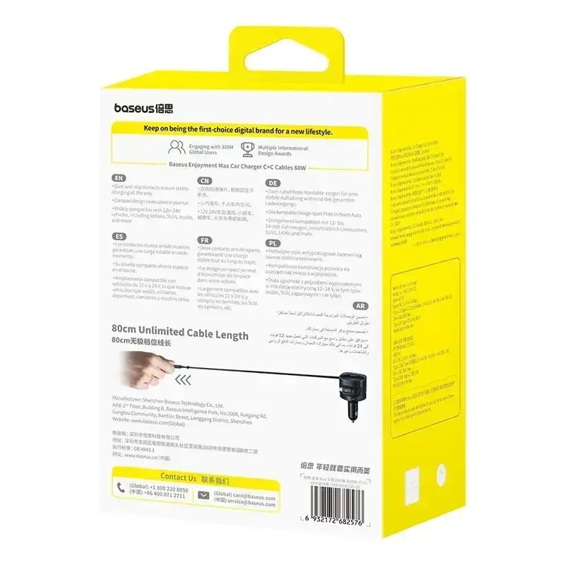 Baseus Enjoyment Max car charger in Cosmic Black is an elegant and efficient car charger. Equipped with built-in C+C cables, it supports 60W power, providing fast and effective charging for devices during travel. The compact design makes it easy to use, and high-quality materials ensure durability. The charger is perfect for charging smartphones, tablets, and other USB-C devices, offering a reliable and stylish solution for all charging needs.