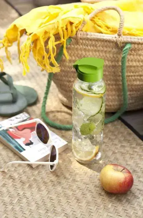 Pudele ir izgatavota no caurspīdīga tritāna, kas līdzīgs dzidram stiklam. Tas ir izturīgs pret bojājumiem, krāsas maiņu un smaku. Ideāli piemērots sporta un tūrisma entuziastiem. Cieša aizdare ļauj droši uzglabāt ūdens pudeli mugursomā, braucienos vai pārgājienos. Ar viegli nolasāmu caurspīdīgu mērskalu var izmērīt nepieciešamās sastāvdaļas, kā piemēram veselīgam smūtijam utt.. Izturīgs materiāls, kas neplaisā un nedeformējas pat bieži mazgājot trauku mazgājamā mašīnā. Materiāls nesatur BPA.