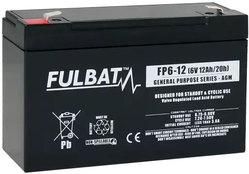 Specially designed for backup and emergency applications, this 6V 12Ah battery provides a service life of up to 5 years under continuous float charge. Built using AGM valve-regulated (VRLA) technology, the battery is completely sealed and maintenance-free. The FP6-12 battery ensures high performance and reliability in continuous standby operation..