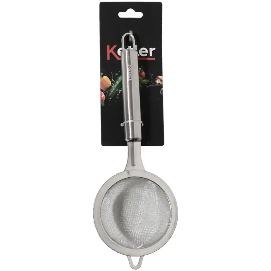 Nerūsējošā tērauda sietiņš ar rokturi Ketler ir daudzfunkcionāls virtuves piederums, kas piemērots tējas, buljona vai miltu izsijāšanai. Smalkais tīkliņš nodrošina precīzu filtrāciju, bet ergonomiskais metāla rokturis ļauj to ērti turēt un lietot ikdienā. Kompaktais izmērs (24.5 x 8.5 x 6.5 cm) padara to par praktisku papildinājumu jebkurai virtuvei, savukārt izturīgais materiāls garantē ilgu kalpošanas laiku. Piemērots gan karstu, gan aukstu šķidrumu filtrācijai.