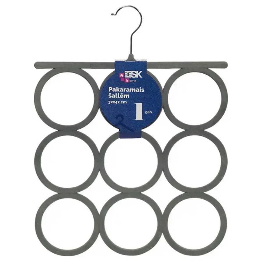 Besk pakaramais ar samta pārklājumu šallēm palīdz uzturēt kārtību skapī un efektīvi organizēt aksesuārus. Pelēkie apaļie gredzeni ar maigu samta virsmu pasargā šalles, lakatus un jostas no slīdēšanas un krokām, nodrošinot, ka katrs aksesuārs ir labi pārskatāms un viegli pieejams. Metāla āķis ļauj pakaramo ērti novietot uz standarta drēbju stieņa, taupot vietu skapī un uzlabojot tā kopējo izskatu. Šis pakaramais ir praktisks risinājums gan mazām garderobēm, gan lielām ģimenes drēbju telpām, kur svarīga ir kārtība un pārskatāma uzglabāšana. Izmērs 32 x 42 cm, komplektā 1 gab.