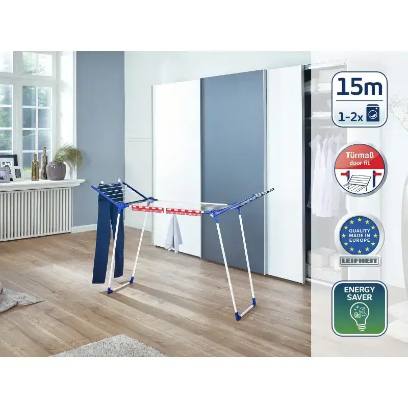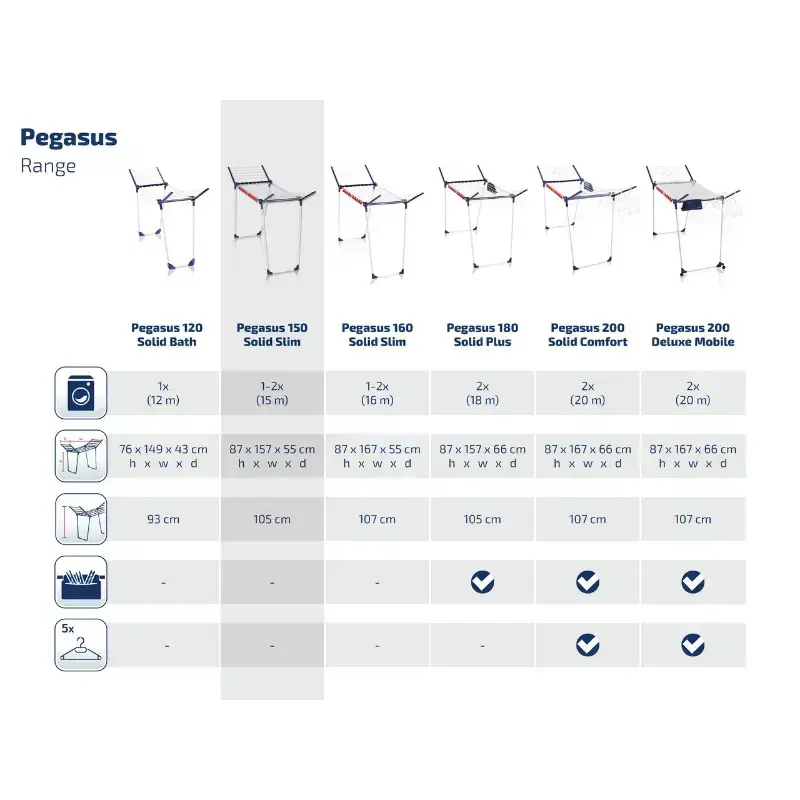 Lai gan Leifheit veļas žāvētājs aizņem ļoti maz vietas, tā kopējais veļas izkāršanas garums ir 15 metri, kas ļauj izkarināt veļu no 2 mazgāšanas reizēm. Pateicoties 105 cm augstajiem spārniem, modelis ir piemērots gariem veļas gabaliem, piemēram, biksēm vai dvieļiem. Pegasus 150 Solid Slim ir vēl ērtāks pateicoties diviem turētājiem mazu apģērbu žāvēšani kā, piemēram, zeķēm, apakšveļai.