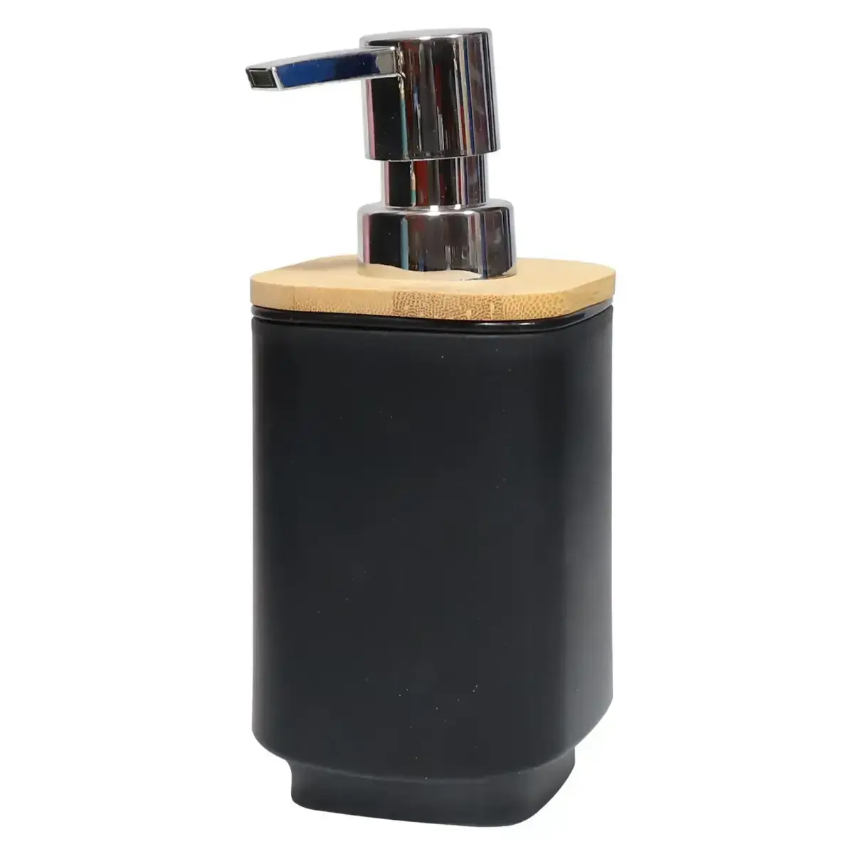 Melns šķidro ziepju dozators izgatavots no izturīgas ABS plastmasas. Traukam ir pievilcīgs bambusa vāciņš un hromēts dozators.