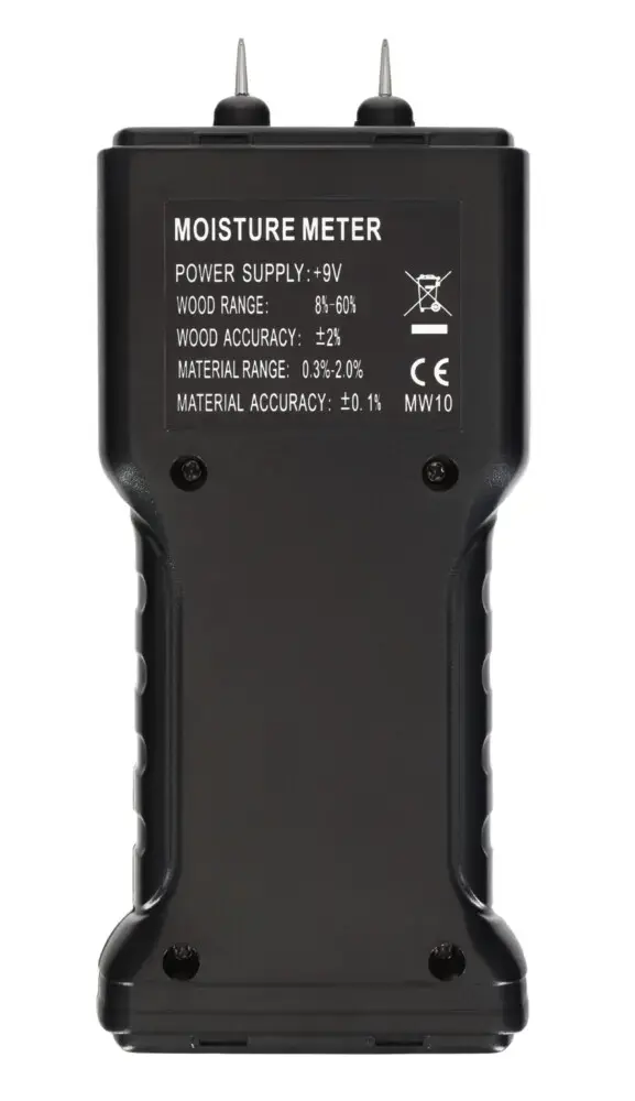 The device is quite compact, lightweight, and easy to hold in your hand. The measurement pins are hidden under the removable cover. You will find a battery compartment for a 9-volt battery at the bottom. In addition, the detector has an auto-off function and a low battery indicator displayed as an icon on the screen to monitor the battery life.
