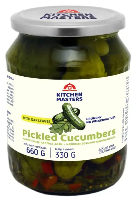 Gurķi marinēti KITCHEN MASTERS, ar ozolu lapām, 660g/330g