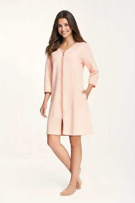 Sieviešu peldmētelis 214 M aprikožu krāsā, ar rāvējslēdzēju un kabatām, reljefs raksts, 100% kokvilna, 7/8 piedurknes