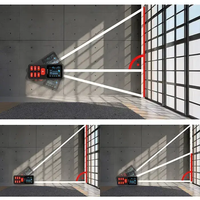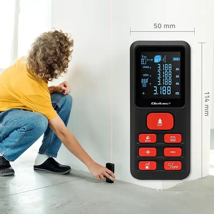 Precision laser meter with distance, area, volume, max/min and Pythagorean measurement functions. The built-in electronic spirit level allows for quick and accurate checking of the slope in degrees.