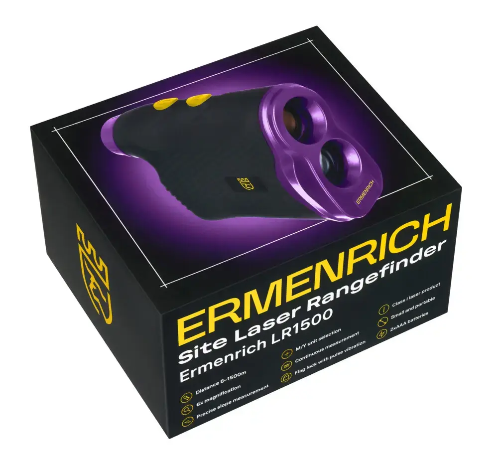 The Ermenrich LR1500 laser rangefinder is designed for measuring the distance to an object over a very long distance up to 1500m (4920ft). Three parameters can be measured: distance, angle, and speed. It is also possible to observe at 6x magnification by using the instrument as a standard monocular. The high measurement accuracy of the rangefinder enables it to be applied in a variety of situations – on large construction sites, when camping to find landmarks, when hunting to track down game, etc.