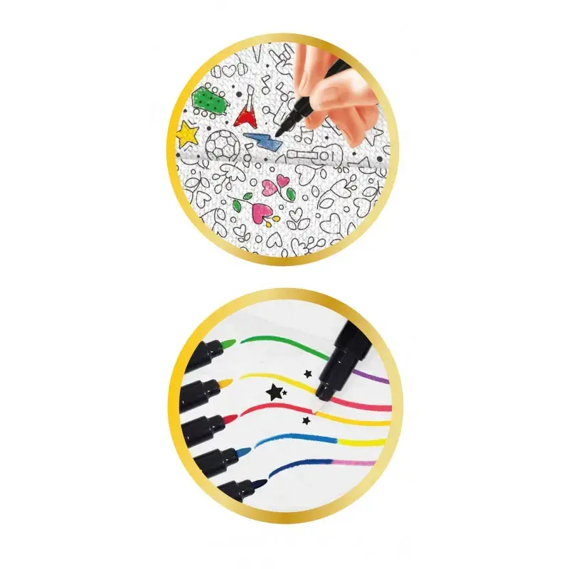 Included : 1 design studio, 1 clip-on light, 1 book, 6 stencils, 2 hole punches, 1 stylus, 6 magic felt-tips, 6 watercolour pencils, 1 paintbrush, 1 black fineliner, 1 pencil sharpener, 1 tube of mini-beads, 2 tubes of glitter, 1 pair of scissors, 1 sheet of beads, 1 sachet of diamonté, 1 bag of mini pompoms, 1 sheet of stickers, 1 tube of glue, 17 sheets of self-adhesive fabric, 5 sheets of coloured A5 paper, 4 ribbons, 1 roll of double-sided sticky tape, 30 boy/girl figure outlines and 1 instruction sheet with colour illustrations.