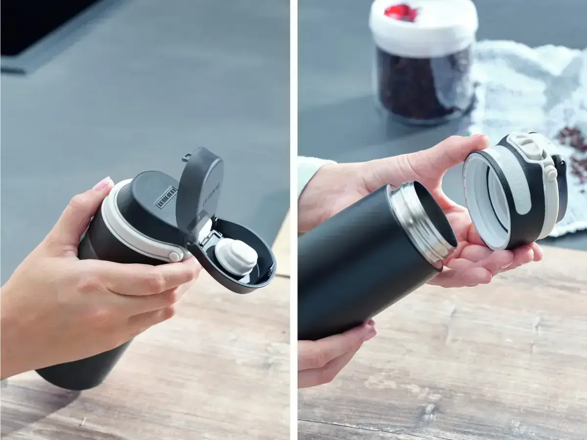The mug is 100% airtight and can be easily and conveniently opened in just one movement. The cap has an additional locking mechanism to prevent accidental opening: this means the mug can be safely carried in your bag.