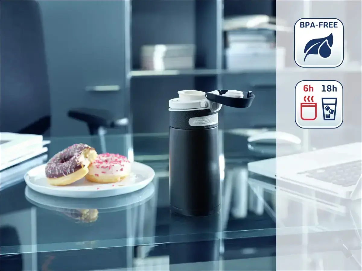 With its compact size,the LEIFHEIT Flip thermo mug is ideal for everyday use and fits easily into most coffee machines. The mug is made without BPA.