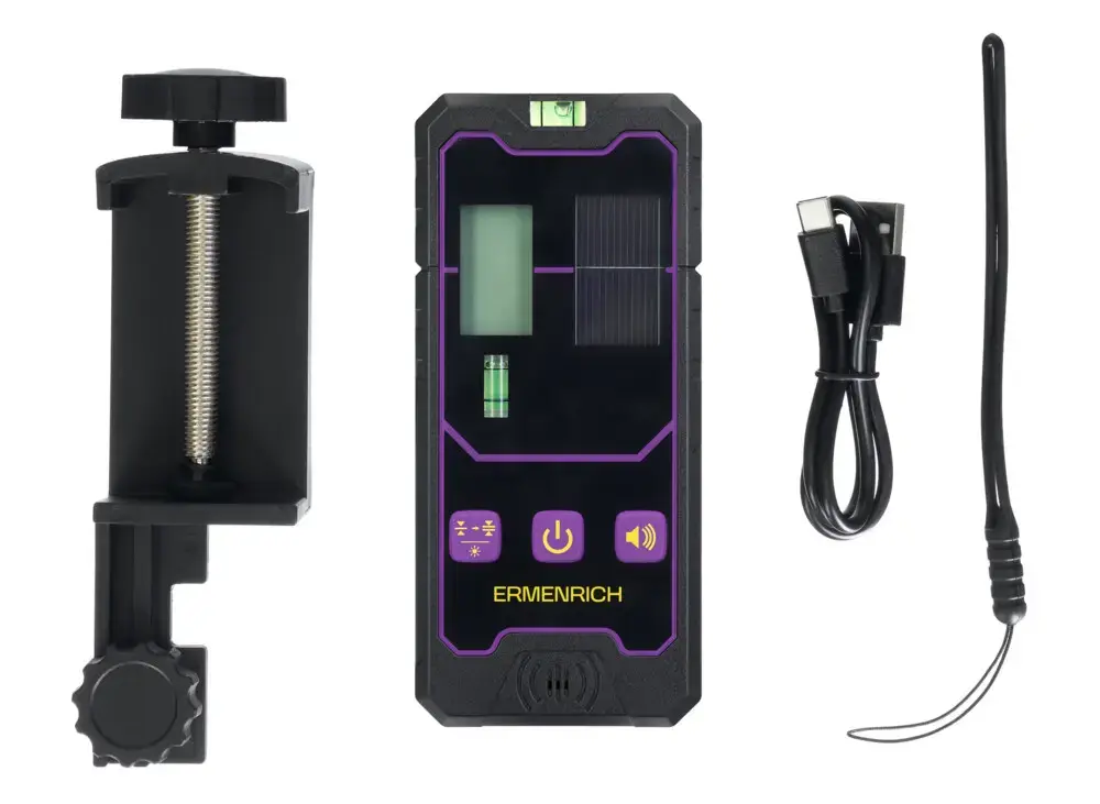 Ermenrich LR20 is a laser receiver for use with laser levels. It recognizes green and red laser beams at a distance of up to 50 meters. The device has two settings of leveling accuracy: high-precision with an accuracy of 2mm and low-precision with an accuracy of 3mm. When the laser beam is captured, the indicators glow, and the buzzer sounds. The volume is adjustable, and the buzzer can be turned off completely, if necessary.
