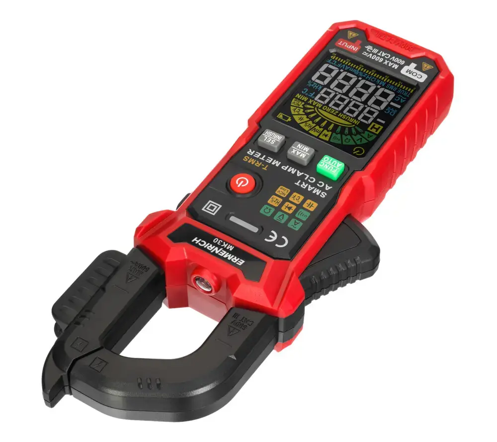 The Ermenrich Ping MK30 digital clamp meter is battery-powered, equipped with an auto-off function, and notifies you of the need to replace the batteries if they are running low.