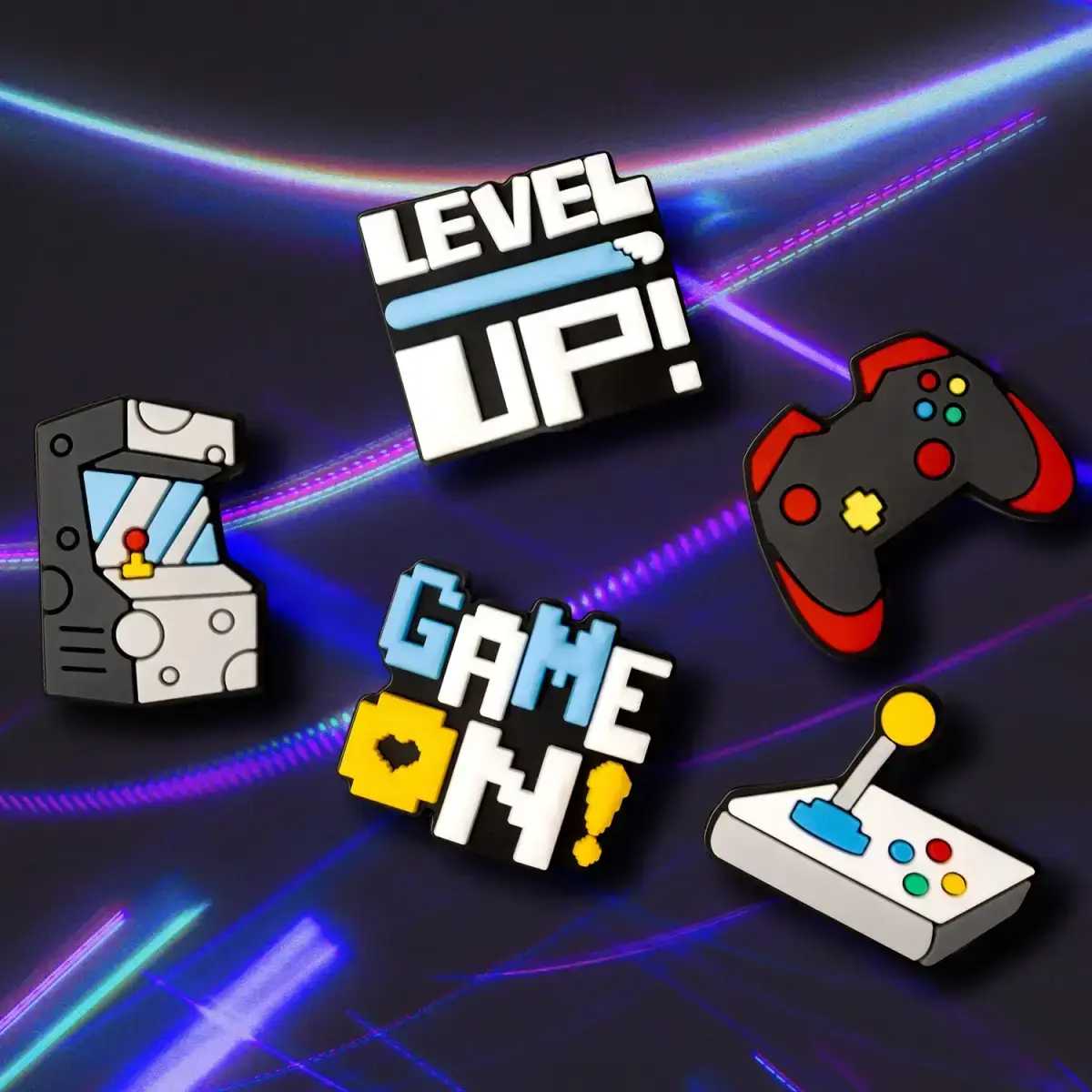 Set of five 3D stickers "Game ON" inspired by retro and modern gaming. The designs feature a joystick, arcade machine, gamepad, and the phrases "Game ON!" and "Level UP!" in an 8-bit pixel aesthetic. Made from flexible, durable PVC resistant to fading. Perfect for personalizing smartphones, laptops, consoles, and gaming accessories, they also make a great small gift.