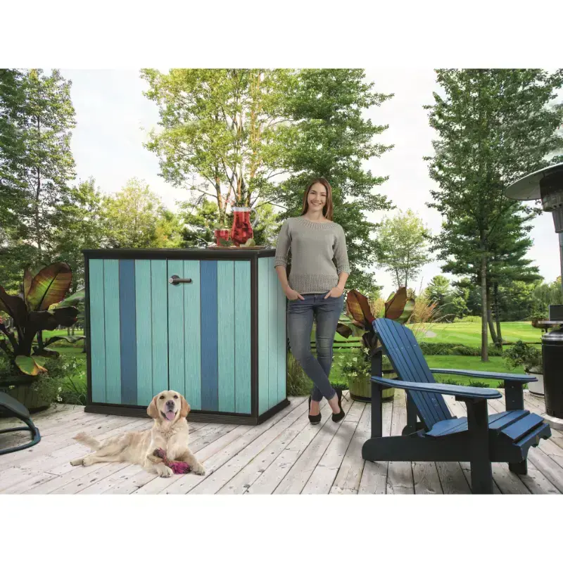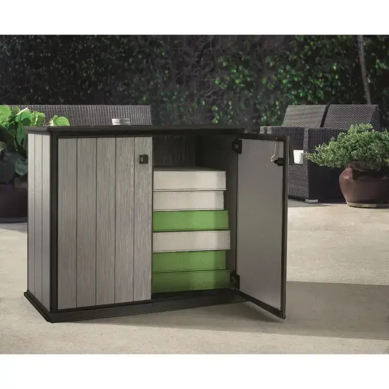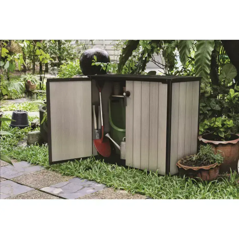 Контейнер для хранения Patio Store отличается простым и элегантным дизайном, универсальной цветовой гаммой и фактурой поверхности, напоминающей натуральное дерево. Patio Store является идеальным решением для мест, где необходимо организовать хранение садовых принадлежностей или предметов, используемых в домашнем хозяйстве. Благодаря оптимальным размерам и горизонтальной конструкции их можно разместить в самых различных местах. Прочная конструкция защищает хранимые предметы от влаги, а высококачественный пластик обеспечивает долговечность изделия на долгие годы. Дополнительным преимуществом является то, что он может быть окрашен в любой цвет.
