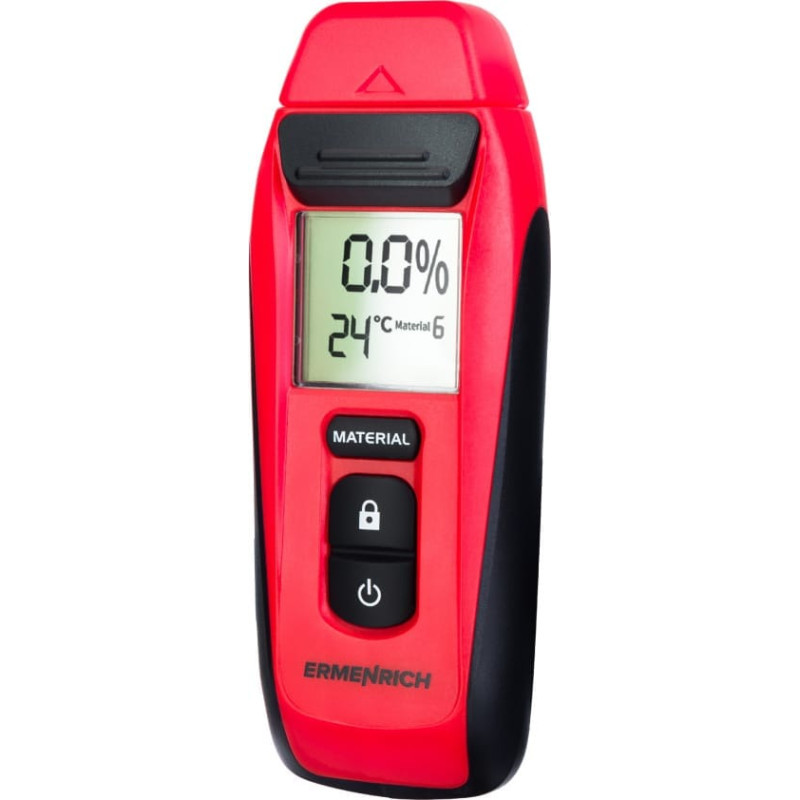 The Ermenrich MW20 is a portable moisture meter or moisture detector. It can quickly measure the moisture level of different materials: wood, cardboard, bamboo, bricks, plaster, screed, or mortar. It is an indispensable tool in construction, carpentry, furniture making, and woodworking, and it is also useful in everyday life, e.g., for renovation work. It is a pin-type moisture detector, i.e., the device has two needles that take the measurements. It not only measures the moisture content of the material but also the temperature. You can choose the type of material you are working with. The data is displayed on the built-in monochrome screen and the control buttons are located below. The device is very compact and lightweight as well as intuitive to operate. It is powered by a single battery and features an auto-off function to save battery power. Key features: