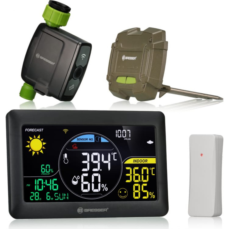 Lai nodrošinātu, ka laikapstākļi jūs nemanot, viedā mājas laistīšanas sistēma parāda arī grafisku laika prognozi ar lietus iespējamību. Un, ja neesat pārliecināts, cik slāņu valkāt, tam ir arī termo-higro bezvadu sensors, kas mēra vietējo temperatūru un āra mitrumu. Aukstās ziemas dienās, tiklīdz temperatūra nokrītas zem 3 °C, displejā parādās sala trauksme.