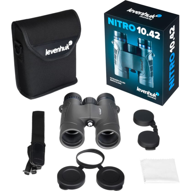 The Levenhuk Nitro 10x42 is a pair of sealed nitrogen-filled field binoculars. Therefore, they are ideal for harsh weather environments, maintaining full performance in high humidity, and direct exposure to water. The optics always provide a clear image – the lenses do not fog up even with extreme temperature changes. These binoculars are the perfect choice for hobbies and work. The BaK-4 glass, which the optical elements are made of, is fully multi-coated, and so the image is sharp and clear throughout the entire field of view – even at dusk, you can easily distinguish all the small details. The magnification is 10x, the field of view is wide enough for panorama observation, and so the binoculars are versatile in use. The focusing wheel is in the center, which is easy to reach with one hand. The right eyepiece has a diopter adjustment ring that allows you to adjust the image sharpness more accurately. There are twist-up eyecups. The body is made of high-strength ABS plastic. The binoculars are resistant to damage and will last a long time. The exterior has a non-slip rubber coating with textured inserts on the optical tubes – it improves the grip and prevents the binoculars from slipping out of your hands. If necessary, the binoculars can be mounted on a tripod (1/4" thread). Key features: