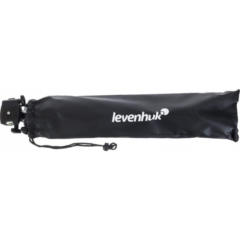 Levenhuk Level BASE TR7 is a basic model of the floor tripod. It is suitable for mounting the equipment of up to 2kg. It can be camera equipment, observation or lighting equipment, smartphones, etc. This tripod has a standard 1/4" thread (adapter not included). The height of the tripod can be easily adjusted by extending the legs or center column. The legs are secured with flip locks. The tilt head is made of plastic, has a control handle, and it allows for full horizontal rotation and back and forth tilting. The fixed platform can be tilted by 90° that provides more device placement options. The bubble level helps you set the tripod as straight as possible. The rubber-coated tripod legs will not slip or scratch the floor. The tripod is compact (when folded), easy-to-fold, and made of lightweight aluminum, which makes it ideal for outdoor trips and long travels. The kit includes a pouch for storage and transportation. Key features: