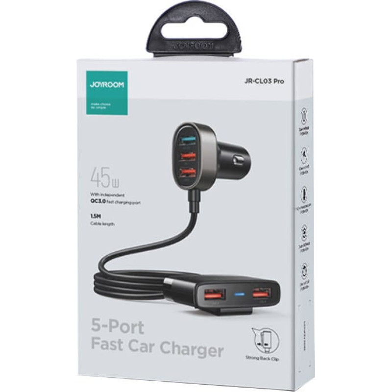 Joyroom JR-CL03 Pro 45W 5xUSB car charger (black)The Joyroom JR-CL03 Pro car charger is designed for people who travel in larger groups - with family or friends, for example. It offers up to 5 USB ports and a long cable so that rear seat passengers can also use it comfortably. The product supports QC3.0 fast charging and is compatible with most popular devices.