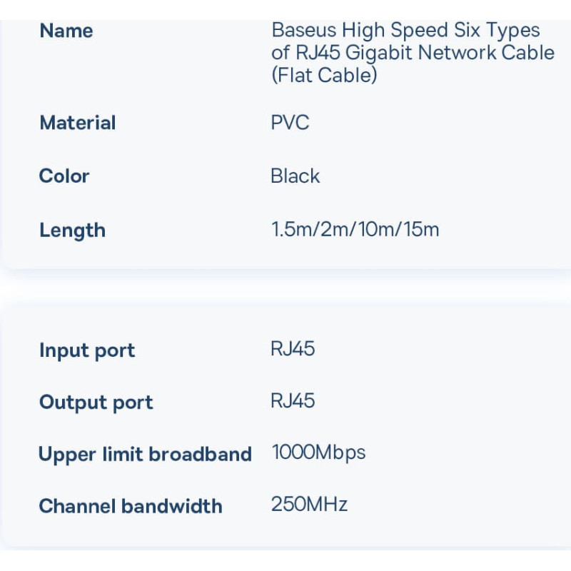 Baseus Ethernet RJ45 network cable, 1Gbps, 10m (black)Surf the internet without any obstacles! With Baseus Ethernet RJ45 your connection will be fast and stable. The transmission speed is 1000Mbps, which allows you to make video calls or video conferences without any problems. The cable is extremely flexible, so you can lay it at different angles. Meanwhile, the thickened cable cores have protection against unwanted interference. Fast and seamless transmissionWith Baseus Ethernet RJ45 your work will become even faster! It will let you download 125MB in just 1s up to 1000Mbps. You can videoconference or watch movies without any loss in quality or unwanted interference without any problems. Thoughtful designThe cable is extremely flexible and flat enough to allow you to coil and store it freely. The RJ45 Ethernet features wear resistance and durability. The plug has a flexible latch that makes disconnecting less of a hassle. Different scenarios, same speedThe cable provides consistent transmission in a variety of scenarios. Enjoy uninterrupted Internet gaming, ensure fast and stable transmission at the office, and watch movies without unwanted interference. Specification: |