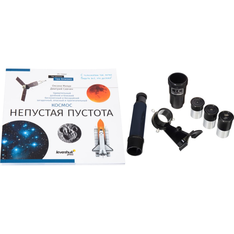 Discovery Channel informs, entertains and inspires its audiences around the globe about the world in all its wonder, diversity and amazement. Offering millions of people the chance to discover, and satisfy their curiosity, Discovery offers a compelling mix of stories across genres including science and technology, exploration, adventure, history and in depth behind-the-scenes glimpses at the people, places and organisations that shape and share the world we live in. We proudly present the Discovery optics series that is produced by Levenhuk and endorsed by Discovery. The Discovery Spark 767 AZ is a classic entry-level Newtonian reflector designed for observation of deep-sky objects. With this telescope, you can study double stars as well as large globular and scattered star clusters. You can see almost all of the deep-sky objects from the Messier catalog but not in high detail. As for the near-Earth objects, you can explore the Moon and the planets of the Earth group. The optics of the Discovery Spark 767 AZ telescope are made of glass with an anti-reflective coating and produce clear, crisp, and sharp images. The alt-azimuth mount allows you to easily control the telescope by moving the tube horizontally and vertically. Pointing at astronomical objects is easy to master even for a beginner. The vertical axis of the mount has a lock knob that ensures high-precision pointing. Three eyepieces and a 2x Barlow lens are included so you can experiment with the magnification. The accessories are stored conveniently on the tripod tray, which is adjustable. It is noteworthy that the knowledge book “Space. Non-Empty Emptiness” is great for all aspiring astronomers and is provided in a colorful gift box along with each telescope and other accessories. The book is a guide to space that will help you learn about celestial bodies or refresh your knowledge before proceeding with stargazing. Key features: