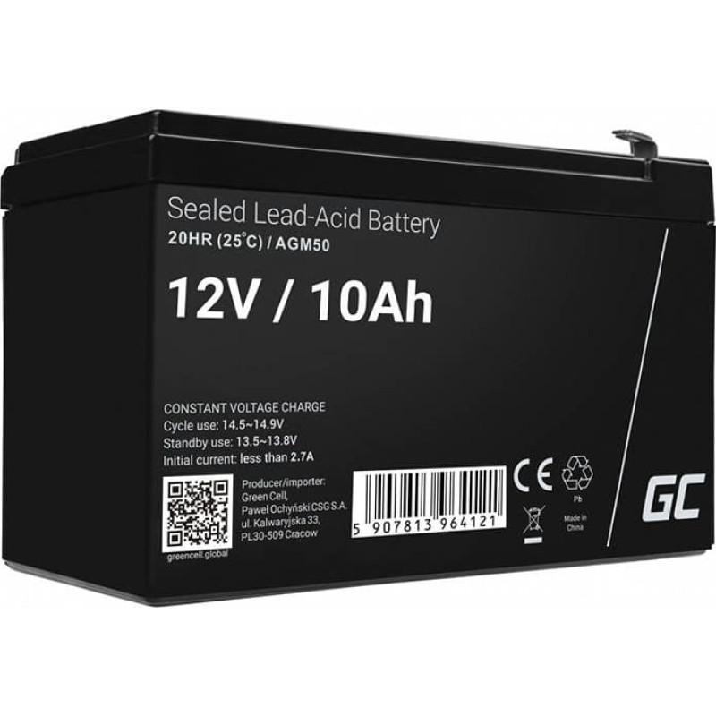 Green Cell AGM VRLA Maintenance-free AGM Battery AGM50 12V 10Ah (for UPS, car, lawnmower).What is an AGM battery? AGM is an energy storage battery with a wide range of commercial applications. Not only can we power toys and alarm systems with it, but it is also the heart of any UPS. Green Cell AGM batteries have a very wide range of applications. They can be used for both cyclic and buffer operation. Cyclic operationThe cyclic use of a battery is to use it as a stand-alone power source. AGMs of this type are prepared for very frequent charging and discharging. Thus, they are used in wheelchairs, photovoltaic installations, golf carts, toys and lawnmowers. Buffer operationBuffer operation allows a battery to act as a backup power supply for a plugged-in device. A battery connected to a power system in the event of a failure of the main power source provides additional power. They are used in this way in alarm systems, UPS, cash registers or emergency lighting. Maintenance-free operationBatteries made with AGM technology were created to ensure the greatest possible safety during use. Thanks to the self-regulation function (VRLA valves), AGMs provide up to 5 years of maintenance-free operation. It increases the safety of the device's operation, regardless of the position of the battery. SafetyAGM batteries are designed for even the most extreme conditions. The fiberglass used ensures that the electrolyte is sealed in the casing which allows the battery to be used in any position without fear of spilling the contents. This is especially important in the case of powered toys, which are exposed to various types of shocks. This makes Green Cell AGM batteries completely safe for users. |