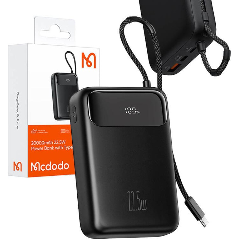 Powerbank Mcdodo MC-3720 20000mAh, USB-C, USB-A, USB-C cable.The Mcdodo MC-3720 powerbank is the ideal solution for those in need of a reliable and multi-functional power source. With a capacity of 20000mAh, it can charge smartphones, tablets and other mobile devices several times, making it the perfect companion for long trips. In addition, the compact, rugged design means you can take it with you almost anywhere, and the built-in USB-C cable eliminates the need to carry extra cables.