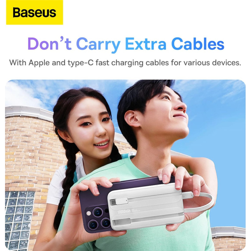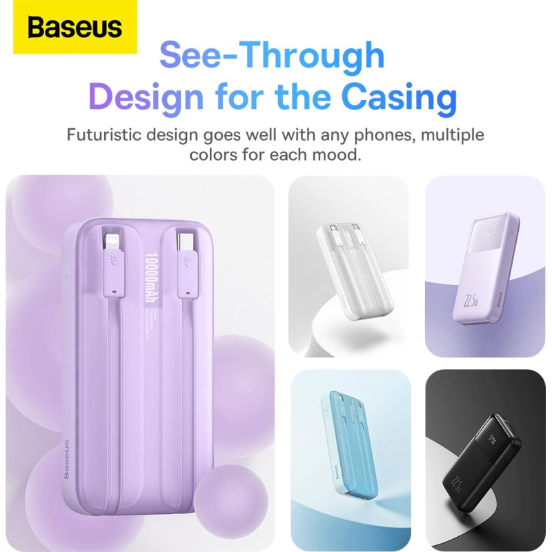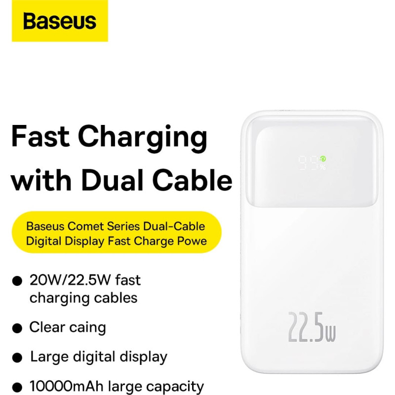 | Baseus Comet Series powerbank with a capacity of 10,000 mAh, power up to 22.5W with built-in USB-C and Lightning cables - white Discover mobility again with Baseus Comet Series! It is not only a capacious power bank, but also a stylish accessory that will meet all expectations. It is ready to meet any challenge - thanks to its 10,000 mAh capacity, an intelligent display showing the current charge level, built-in USB-C and Lightning cables, and certificates for many fast charging protocols. Additionally, its transparent housing adds lightness and unique style. The most important advantages of the Baseus Comet Series power bank with a capacity of 10,000 mAh: