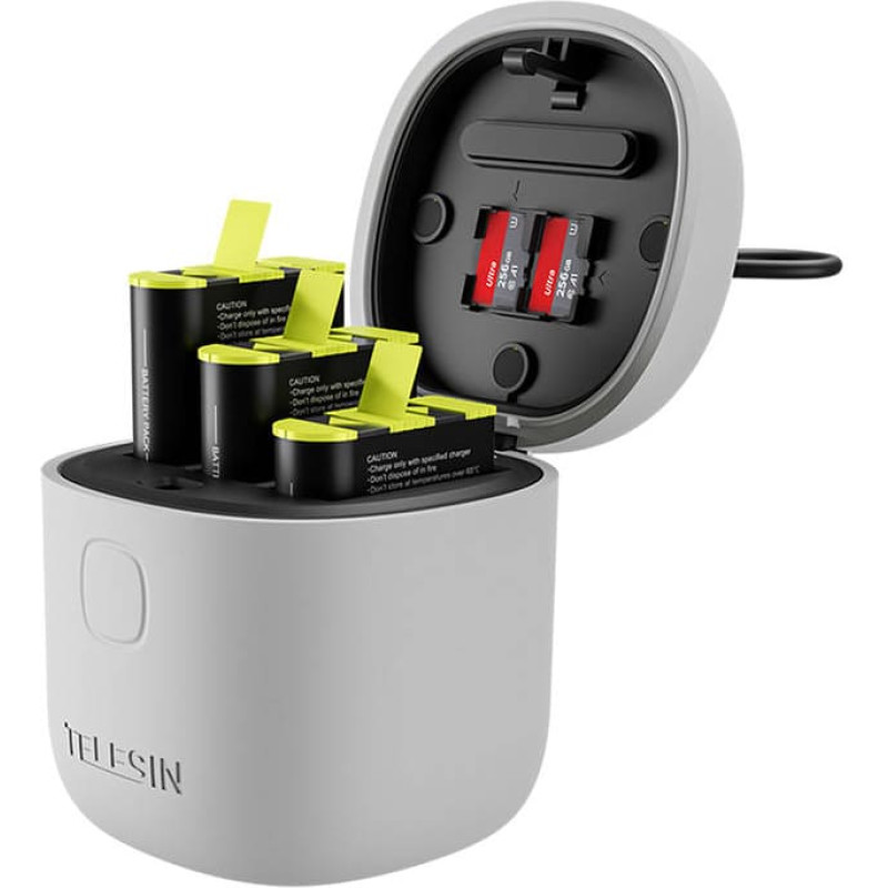 Allin box Telesin waterproof three-channel charger for GoPro Hero 9 / Hero 10 + 3 batteries (GP-BTR-906-GY-B)This practical kit by Telesin will make it much easier for you to use your GoPro Hero 9 and Hero 10. The charger supports fast charging of up to 3 batteries simultaneously. It will also prove useful as a memory card reader - allows for instant file transfer. It is also extremely lightweight and handy, and thanks to IP54 water resistance you can use it every day without worry. Enjoy the benefits of quick chargingThanks to quick charging, your sports camera will be ready for use again very quickly. You can use the charger to charge up to three batteries at the same time - it only takes about 2.5 hours to fully charge them all! This means that you can get back to creating spectacular shots in a very short time. Charger and TF card reader in oneNeed a reliable TF card reader? The Telesin charger will not let you down either. It supports the ultra-fast file transfer protocol over USB. To copy 1 GB of data, it only takes a minute! This multifunctional device will therefore prove indispensable in many situations. Unlimited recordingThe batteries you will find in the set can significantly extend the working time of your camera. They are fully compatible with GoPro Hero 9 and Hero 10 - you do not have to worry about errors or other problems. From now on, you can record for long hours without worrying about your equipment discharging too quickly! Fantastic designThe charger is distinguished by a stylish, yet functional design. It can store 3 batteries and 3 TF cards. It weighs only 147.6 g, and thanks to its compact size you can easily fit it in your backpack or handbag. You can easily transport the device with a short lanyard, with which you can attach it to your bag or hang it on your finger. What's more, the IP54 waterproof rating means you don't have to worry about accidentally splashing the charger. Included