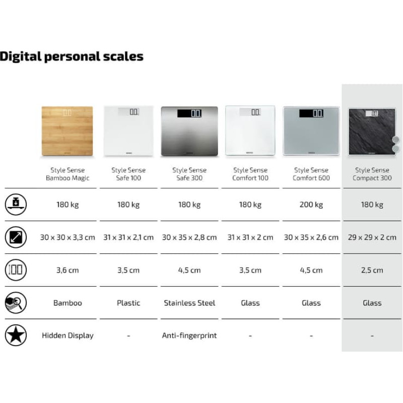 Style Sense Compact 300 Slate svari ar savu stilīgo betona izskatu ir acij tīkami ikvienā interjerā. Tā virsma, kas izgatavota no augstas kvalitātes droša stikla, piedāvā ērtu statīvu un celtspēja līdz 180 kg. Tiklīdz jūs uzkāpjat uz svēršanas virsmas, skala ieslēdzas un ir viegli lasāma (cipara augstums 2.5cm). Pēc svēršanas tie automātiski izslēdzas - tas ietaupa enerģiju un ļauj ilgstoši izmantot komplektācijā iekļautās baterijas. Bateriju nodalījums ir cieši pieskrūvēts, tādējādi nodrošinot drošību.