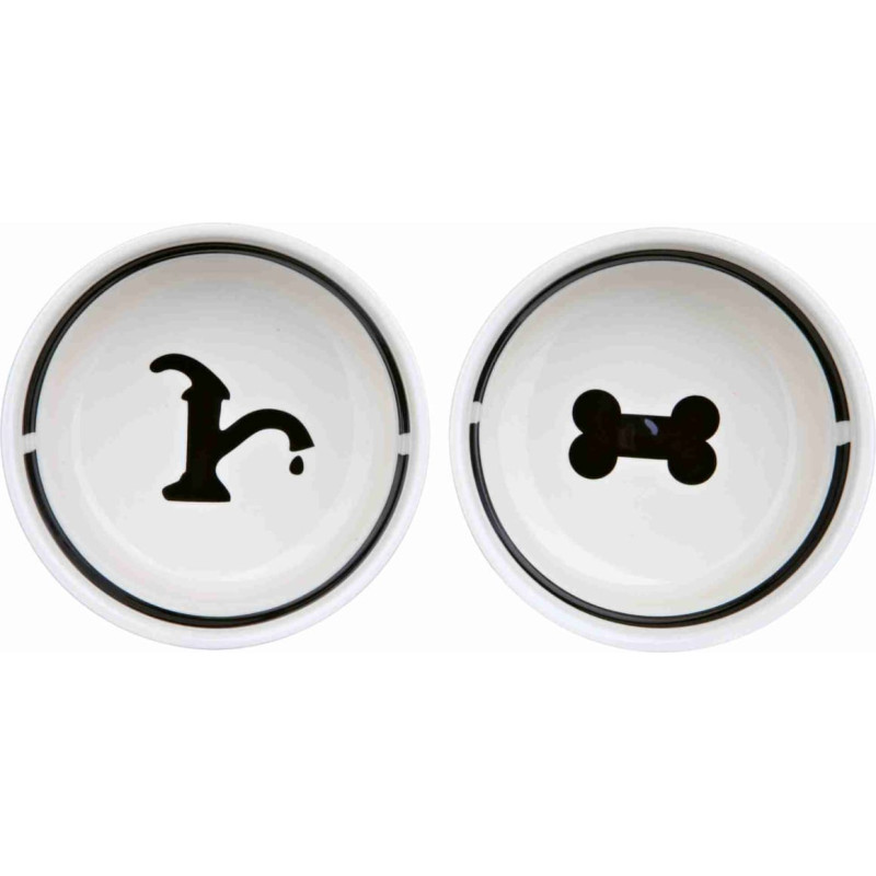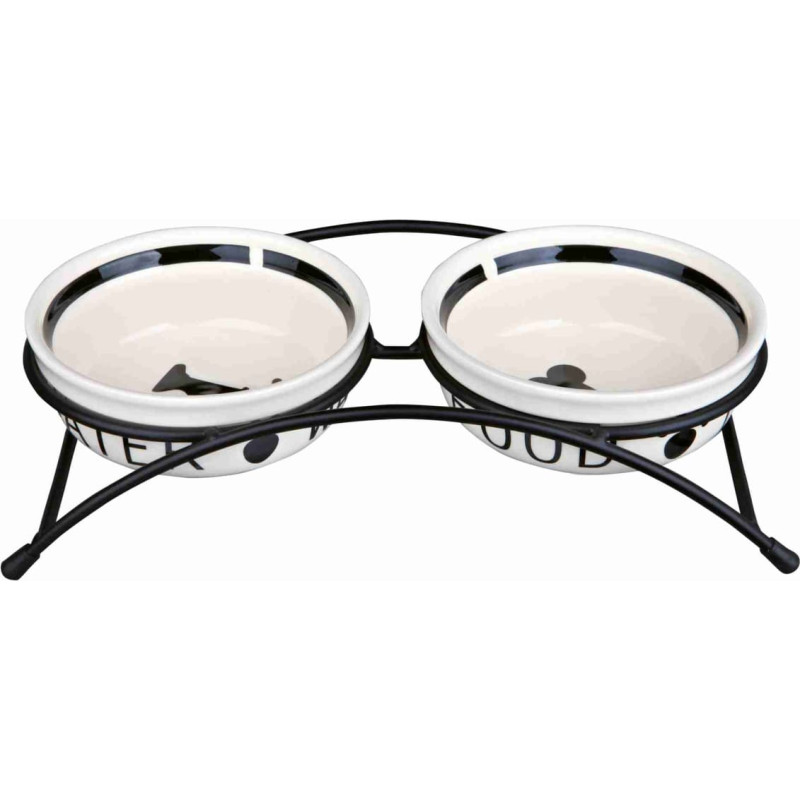 Jūsu iepirkumu grozs ir tukšs! Trixie Paliknis ar bļodām : Trixie Eat on Feet bowl set, 2 × 0.25 l|, ø 13 cm, white|black
