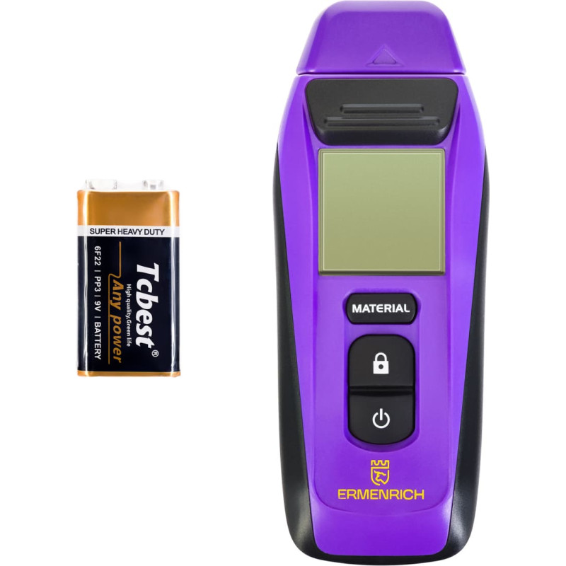 The Ermenrich MW20 is a portable moisture meter or moisture detector. It can quickly measure the moisture level of different materials: wood, cardboard, bamboo, bricks, plaster, screed, or mortar. It is an indispensable tool in construction, carpentry, furniture making, and woodworking, and it is also useful in everyday life, e.g., for renovation work. It is a pin-type moisture detector, i.e., the device has two needles that take the measurements. It not only measures the moisture content of the material but also the temperature. You can choose the type of material you are working with. The data is displayed on the built-in monochrome screen and the control buttons are located below. The device is very compact and lightweight as well as intuitive to operate. It is powered by a single battery and features an auto-off function to save battery power. Key features: