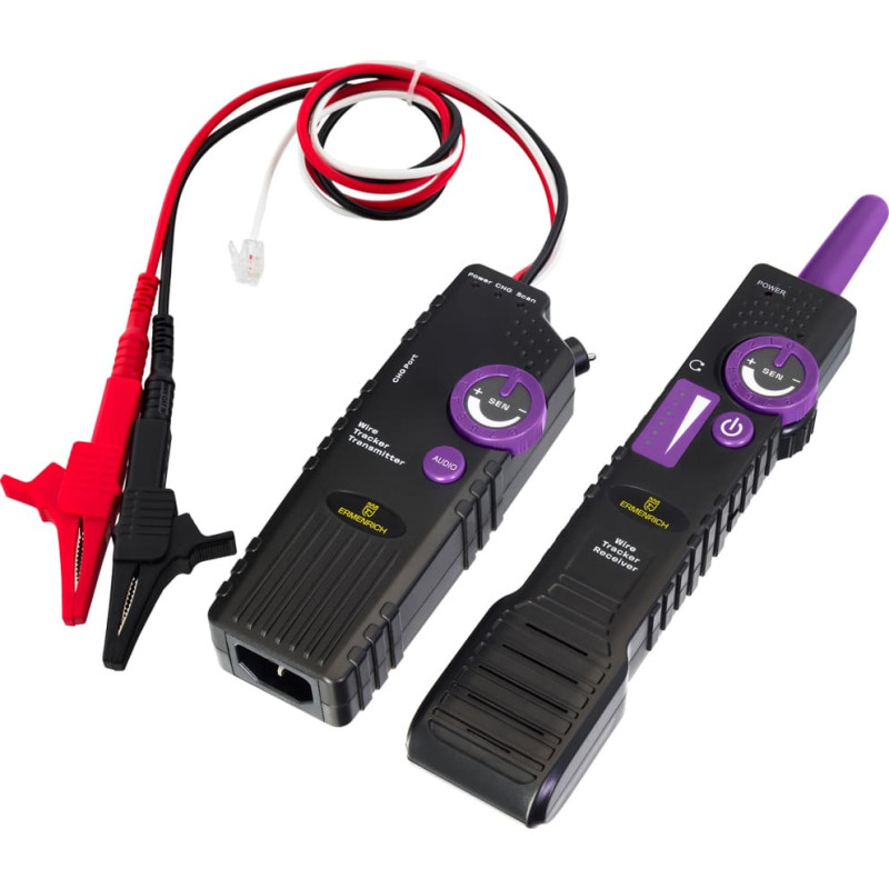 | Brand | Ermenrich | | Warranty | 5 years | | EAN | 5905555023090 | | Package size (LxWxH) | 30x13x6 cm | | Shipping Weight | 0.6 kg | | Delimiter | Ermenrich Ping SM100 Wire Tracker | | === Delimiter === | Transmitter | | Ports | microUSB, RJ11, power supply, alligator clips | | Tracing cable types | telephone, coaxial, common wires, power cable, network cable | | Maximum detection depth, m (ft) | 2 (6.6) | | Maximum possible voltage of the circuit under test, V | 400 | | Polarity test | yes | | Crosstalk protection | yes | | Maximum signal transmission distance, m (ft) | 10000 | | Peak output signal voltage, V | 21 | | Signal transmission format | multifrequency impulse | | Adjustable sensitivity | yes | | Maximum operating current, mA | <150 | | Power supply | 1400mAh, 3.7V lithium battery; charging via 5V, 1A DC adapter (not included) and micro USB cable (included) | | Low battery status indicator | yes | | Operating temperature range, °C | -10 — 40 | | Operating humidity range, % | 30 — 60 | | === Delimiter === | Receiver / Remote unit | | Ports | microUSB, earbuds | | Maximum operating current, mA | <80 | | Adjustable sensitivity | yes | | Speaker | yes | | Power supply | 1400mAh, 3.7V lithium battery; charging via 5V, 1A DC adapter (not included) and micro USB cable (included) | | Low battery status indicator | yes | | Operating temperature range, °C | -10 — 40 | | Operating humidity range, % | 30 — 60 |