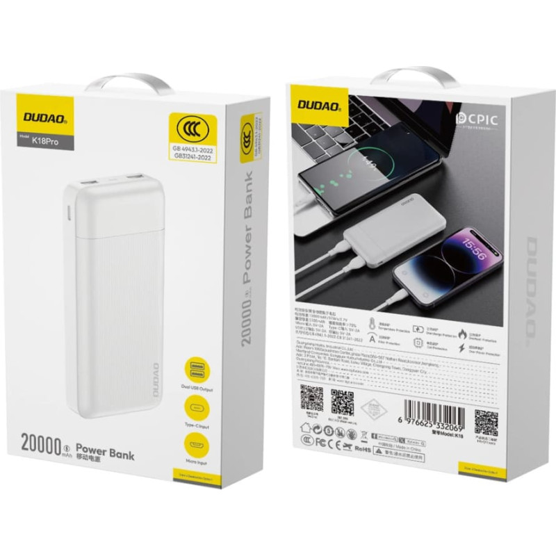 | Powerbank Dudao K18 Pro 20000mAh USB-A / USB-C / Micro USB - white The Dudao K18 Pro 20000mAh power bank is the perfect solution for those who need a reliable source of energy while traveling, working, or during everyday challenges. With a capacity of 20000mAh, you can easily charge your mobile devices even several times, and the ability to charge two devices at the same time provides additional convenience. The variety of available connectors - USB-A, USB-C and Micro USB - makes it an extremely versatile device that works with most electronic devices. The Dudao K18 Pro is also safe for air transport, making it the perfect companion on every trip. Specification: