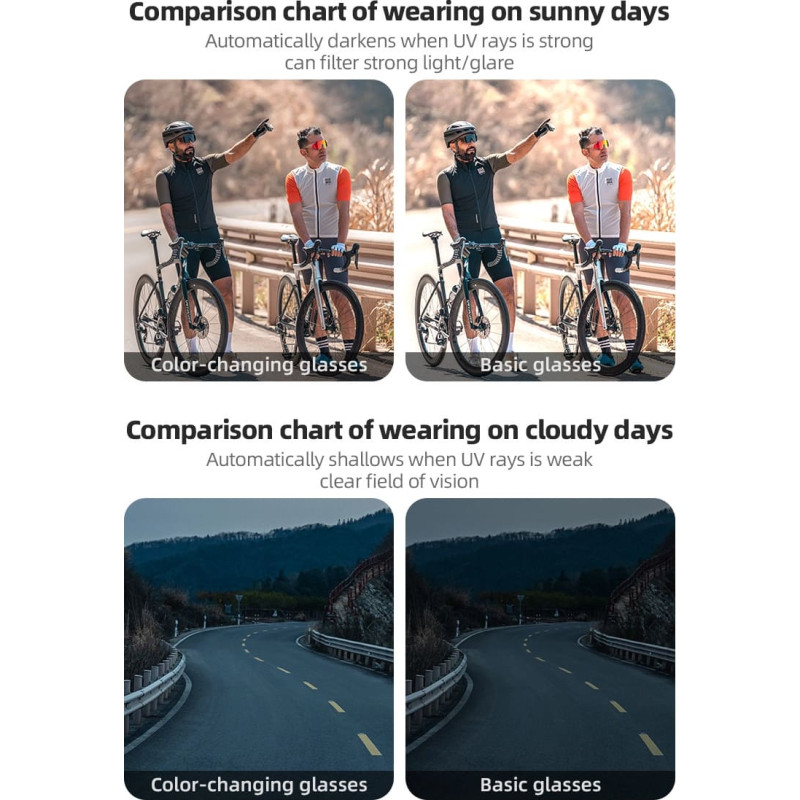 ~ Photochromic lenses adjust to the lightThe lenses intelligently darken in bright light and lighten in shade â perfect for any weather, without having to change your glasses. Optical insert for people with myopiaThanks to the special prescription frame, you can use your own lenses, maintaining comfort and sharp vision even during sports. UV400 filter protects eyes from radiationThe glasses block up to 100% of UVA and UVB rays, which protects the retina from damage and reduces eye fatigue. Durable and lightweight TR90 frame ensures comfort when wearingThe TR90 material is deformation-resistant and very lightweight, making the glasses ideal for long journeys and intense physical activity. Design and construction adapted to an active lifestyleStylish, wide lenses, removable nose pads and anti-slip elements ensure that the glasses stay in place and look great in every situation. |