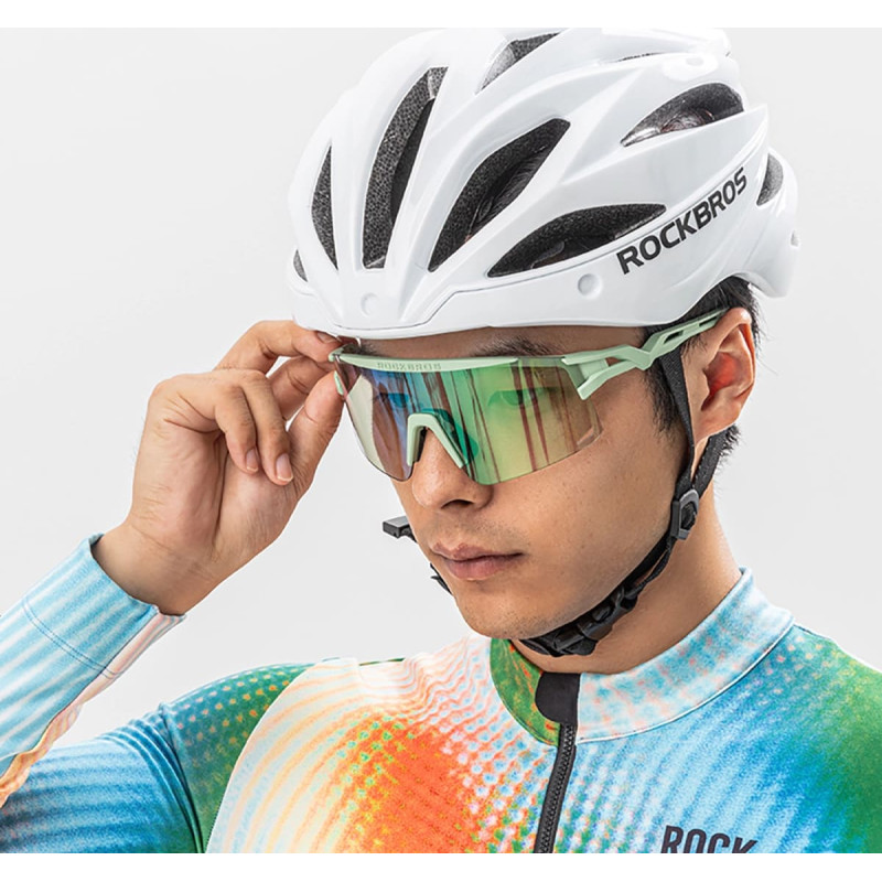 | Rockbros Photochromic Cycling Glasses with UV Protection and Corrective Insert - White Rockbros photochromic cycling glasses in white are the perfect choice for any active two-wheeler enthusiast. Designed with maximum comfort and protection in mind, they combine functionality, style and modern technologies. Thanks to photochromic lenses that intelligently adapt to changing light conditions, you gain full visibility and riding comfort regardless of the weather. The built-in frame for myopia allows people with visual impairments to use the glasses. The UV400 filter effectively protects the eyes from UVA and UVB radiation, and the lightweight TR90 frames provide comfort even on long routes. The large, highly resistant lens not only protects against wind and dust, but also adds style. Rockbros is a combination of comfort, durability and modernity - ideal for cycling, running or hiking. ~ Specification: