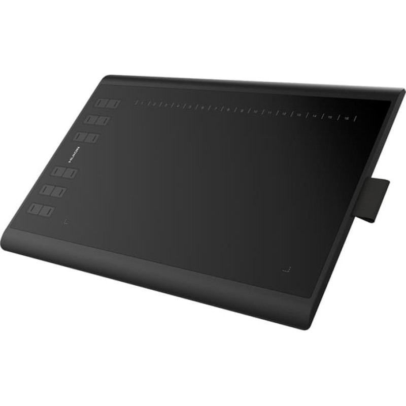 Graphic Tablet Huion H1060PThe Huion H1060P graphics tablet offers a working space of 254 x 158.8 mm and a resolution of 5080 LPI, allowing for convenient and precise graphics creation. The device supports 8192 pressure levels and detects the tilt of the stylus up to ±60°, allowing you to vary lines according to the strength and angle of the stroke. With a reporting frequency of more than 220 PPS and motion detection from as little as 10 mm away. There are 12 programmable physical and 16 touch-sensitive buttons on the chassis, which greatly facilitate daily work. The device works with Windows, macOS, Android and Linux and uses a micro USB port connection. The included PW100 stylus does not require charging.