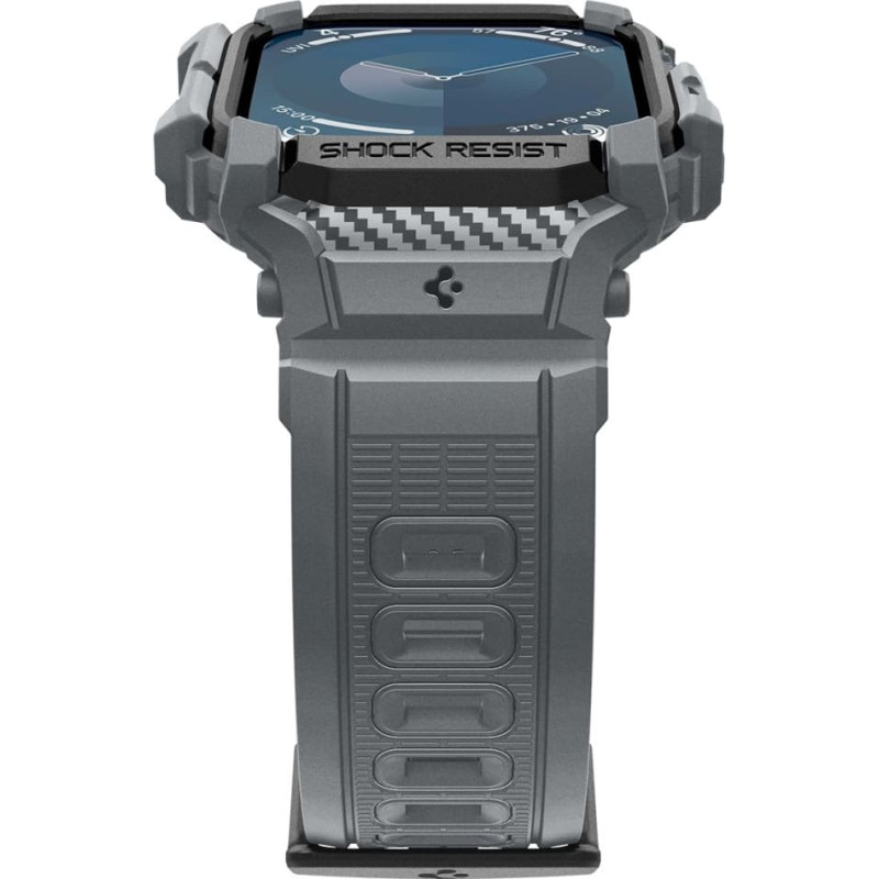 A comfortable strap with a sporty flair, the Spigen Rugged Armor Pro is made of flexible TPU material decorated with carbon fiber accents. It features an integrated case with accentuated edges to protect the watch envelope from scratches and impacts. The strap is fully functional and adjustable according to individual needs. PRODUCT FEATURES: SET INCLUDES: