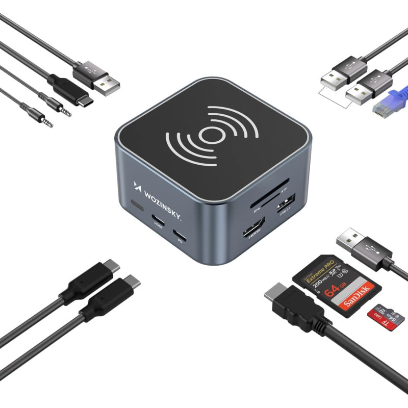 | Wozinsky WHBC09Y8S 12-in-1 USB-C Hub, Multifunctional, Wireless Charging, Aluminum, with 15cm Cable â Gray The Wozinsky WHBC09Y8S multifunctional USB-C hub is an advanced connection and power center for your laptop, tablet or smartphone. It offers 12 ports, including fast HDMI 4K, USB 3.2 Gen2 10Gbps ports, SD/TF card readers, RJ45 Ethernet, audio connectors and 15W wireless charging. Support for the DP Alt Mode 1.4 standard allows you to display images in up to 4K/60Hz quality. Whether you want to work on several screens, transfer data at breakneck speeds or quickly charge devices - this hub will cope with any task. Built-in chipsets guarantee stability and wide compatibility, and the elegant aluminum housing ensures excellent heat dissipation. It is an ideal solution for demanding users who need a reliable docking station for work and entertainment. ~ Specification: