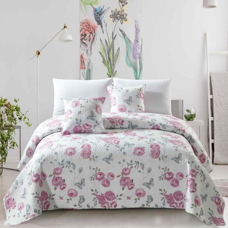 Jūsu iepirkumu grozs ir tukšs! Dekoratīvs gultas pārklājs 240x260 balts ar rozā ziediem stepēts Calmia