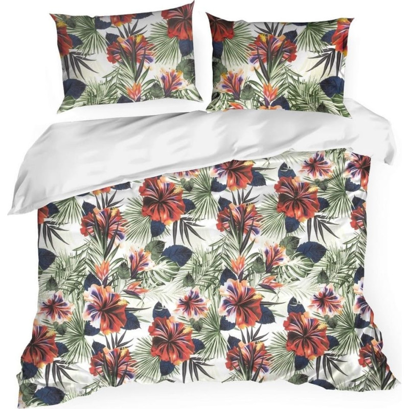 Jūsu iepirkumu grozs ir tukšs! Satīna gultasveļa 220x200 Nelly ziedi palmu lapas monstera eksotiski augi balts sarkans oranžs zaļš tumši zils