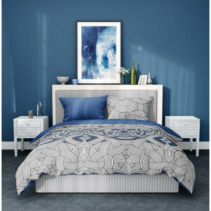 Jūsu iepirkumu grozs ir tukšs! Satīna gultas veļa 220x200 Elegant 002 ģeometrija zila balta melna abpusēja