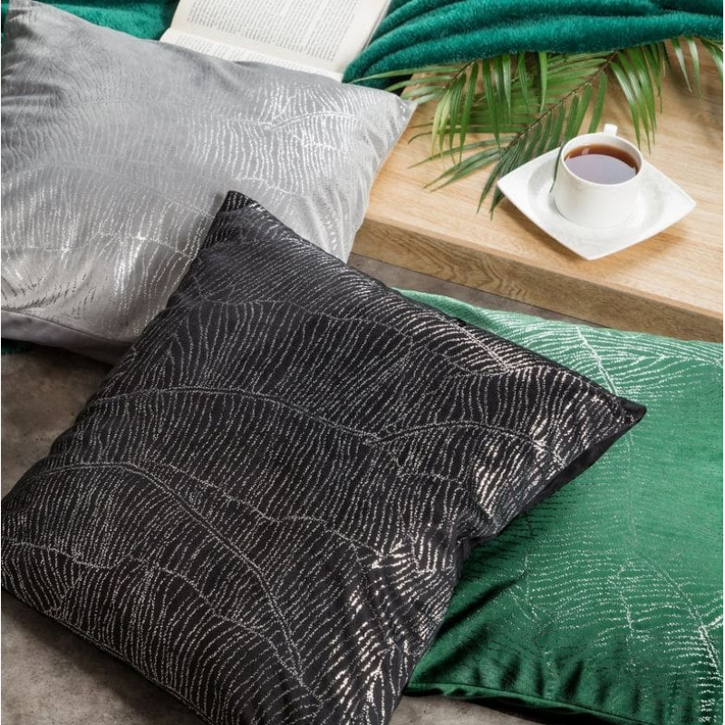 Jūsu iepirkumu grozs ir tukšs! Dekoratīvā spilvendrāna 45x45 Blink 13J tumši tirkīza ar sudraba banānu lapu velūra motīvu