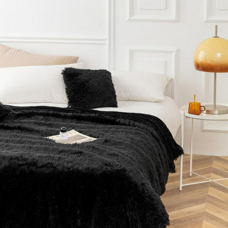 Jūsu iepirkumu grozs ir tukšs! Sega gultas pārklājs 200x220 Yeti pūkaina melna kažokāda uz gultas