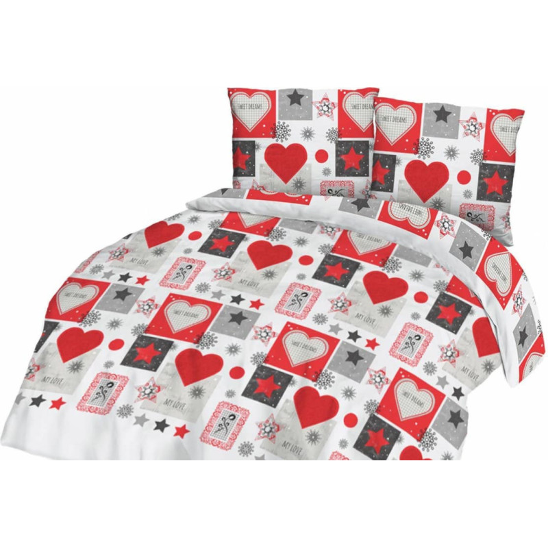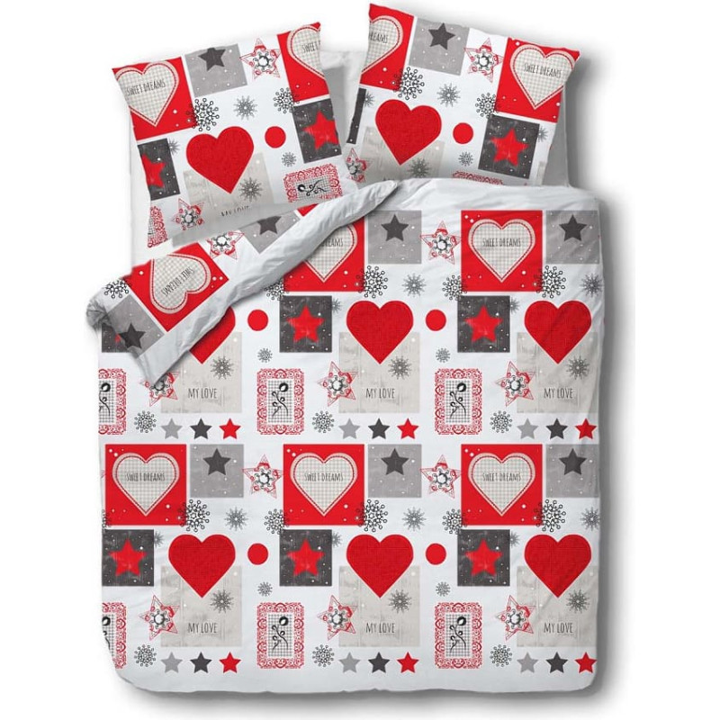 Jūsu iepirkumu grozs ir tukšs! Flaneļa gultas veļa 160x200 Ziemassvētki 31482/1 pelēki sarkani balti sirsniņas zvaigznes sniegpārslas